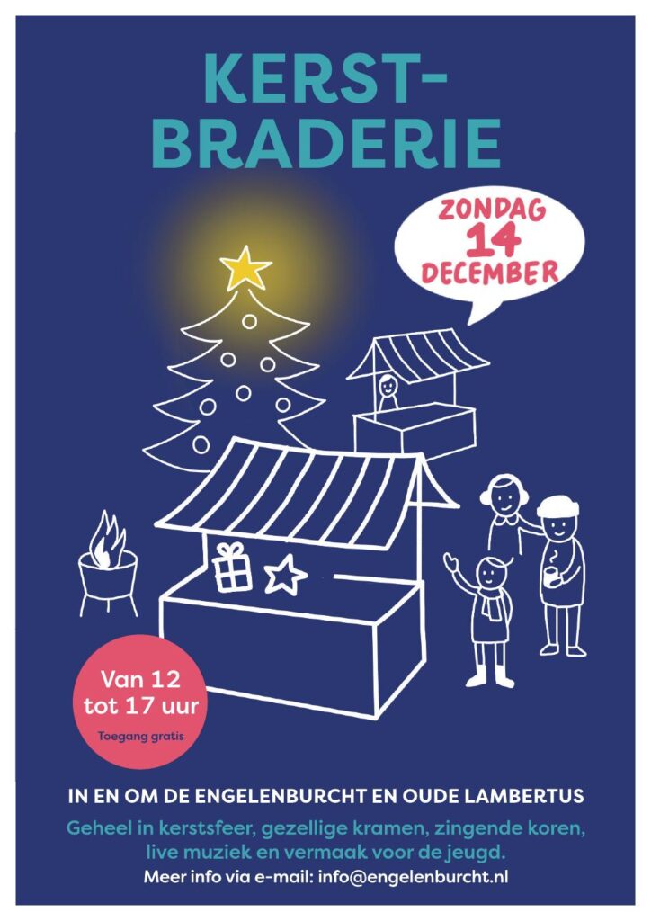 Kerstbraderie in en om De Engelenburcht en Oude Lambertus kerk op 14 december van 12:00 tot 17:00 uur. Geheel in kerstsfeer, gezellige kramen, zingende koren, livemuziek en vermaak voor de jeugd.