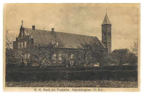 Ca. 1936. De R.K. Lambertuskerk in Hedikhuizen waarvan de toren in 1944 door de Duitsers werd opgeblazen